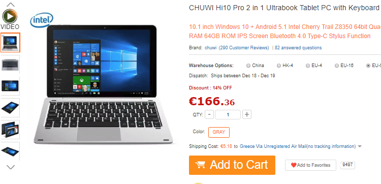 Η τιμή του CHUWI Hi10 θα βρίσκεται στα €166.36 με απευθείας αποστολή από τις Ευρωπαϊκές αποθήκες του Gearbest, που σημαίνει ότι δεν υπάρχουν τελωνειακοί δασμοί. Μπορούμε να το αγοράσουμε από εδώ.