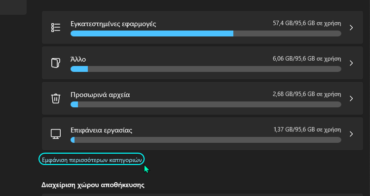 Όταν ελέγχουμε τη χρήση αποθήκευσης στα Windows 11, συχνά παρατηρούμε ότι μια τεράστια ποσότητα δεδομένων κατηγοριοποιείται ως Στοιχεία συστήματος και δεσμευμένα στοιχεία (τα εντοπίζουμε από τη διαδρομή Ρυθμίσεις Windows > Σύστημα > Χώρος αποθήκευσης > Εμφάνιση περισσότερων κατηγοριών).