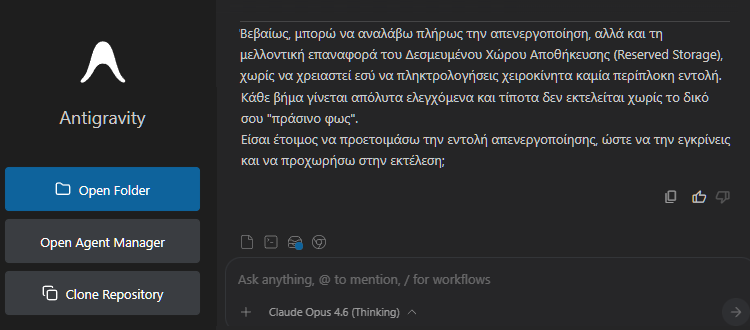 Επομένως, αν θέλουμε τον απόλυτο βοηθό ή δεν είμαστε εξοικειωμένοι με τις εντολές, όταν θέλουμε να ενεργοποιήσουμε ξανά το Reserved Storage ή να το απενεργοποιήσουμε πάλι όταν το επιθυμούμε, απλώς το λέμε στους AI agents του Antigravity για να κάνουν αυτόματα όλη την εργασία για εμάς.