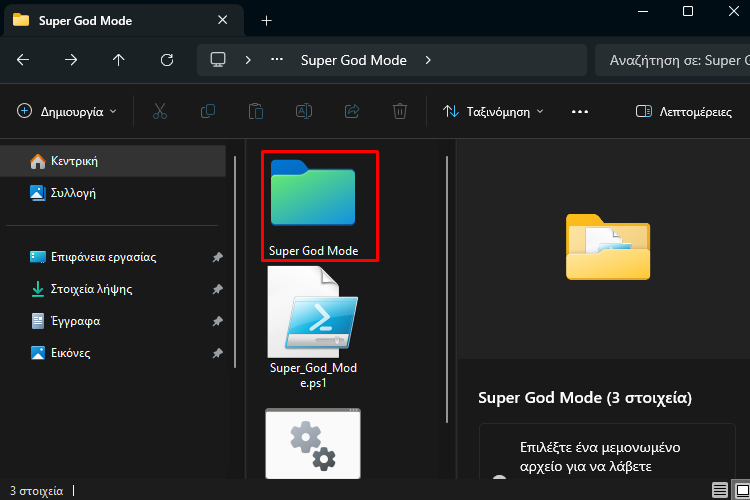 Μέσα στον φάκελο “Super God Mode”, θα εμφανιστεί ένας νέος φάκελος με το όνομα “Super God Mode” και πράσινο / μπλε εικονίδιο.