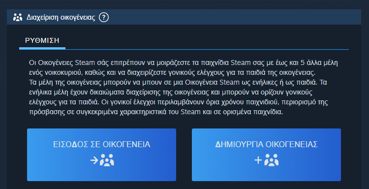 Στο Steam μπορούμε να δημιουργούμε μία “οικογένεια” στην οποία προσθέτουμε έως έξι χρήστες με τους οποίους έχουμε τη δυνατότητα να μοιραζόμαστε τα παιχνίδια μας.
