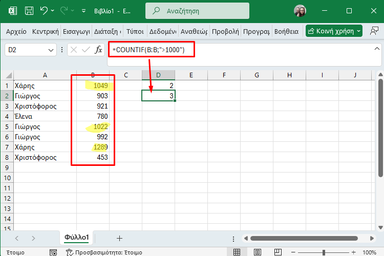 Ομοίως, η ακόλουθη συνάρτηση μετράει πόσοι αριθμοί στη στήλη B είναι μεγαλύτεροι από “1000”.