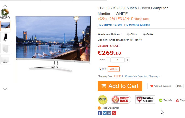 Η τιμή της λεπτής καμπύλης οθόνης θα βρίσκεται στα €269.02. Μπορούμε να την αγοράσουμε από εδώ με φθηνή και ταχεία αποστολή από τις Ευρωπαϊκές αποθήκες, που σημαίνει ότι δεν υπάρχουν τελωνειακοί δασμοί.