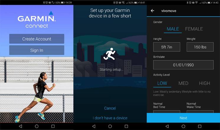 Η εφαρμογή διατίθεται μόνο στα Αγγλικά, και μετά την εγκατάσταση απαιτεί τη δημιουργία ενός λογαριασμού Garmin. Μετά τη δημιουργία του λογαριασμού, ζητά να δώσουμε μερικά στοιχεία για εμάς.