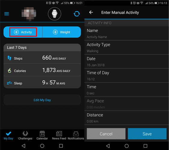 Το Garmin Vivomove, λόγω την έλλειψης GPS, δεν μπορεί να καταγράψει την τρέχουσα δραστηριότητά μας. Παρ’ όλα αυτά, μπορούμε εμείς οι ίδιοι να προσθέσουμε χειροκίνητα την άσκηση.