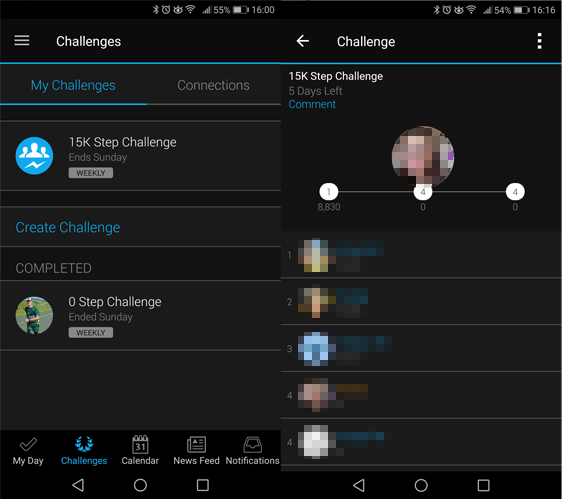 Στο “Challenges” μπορούμε να πάρουμε μέρος στην εβδομαδιαία πρόκληση βημάτων, όπου ανταγωνιζόμαστε με άλλους χρήστες που έχουν αντίστοιχα στατιστικά με εμάς.