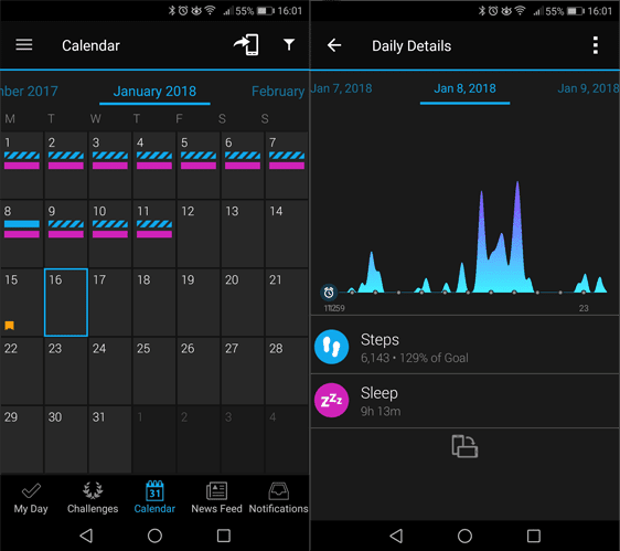 Η επόμενη καρτέλα είναι το “Calendar”, στο οποίο βλέπουμε συνοπτική καταγραφή των δραστηριοτήτων μας. Πατώντας στην εκάστοτε ημέρα, βλέπουμε πιο αναλυτικά γραφήματα.