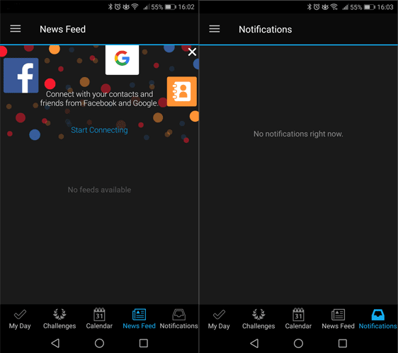Η εφαρμογή χωρίζεται σε πέντε καρτέλες: την ημέρα μας, τις προκλήσεις, το ημερολόγιο, τα νέα, και τις ειδοποιήσεις.