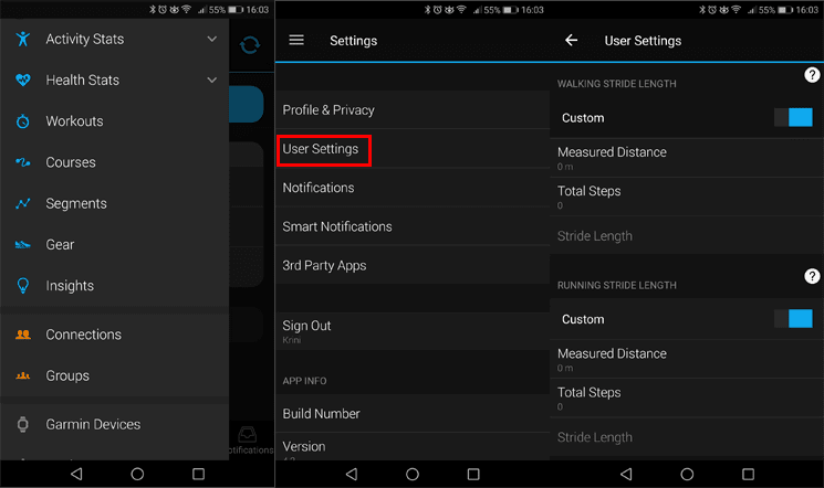 Το πιο σημαντικό κομμάτι των ρυθμίσεων είναι οι επιλογές χρήστη (User Settings). Μέσω αυτών, μπορούμε να βάλουμε τα στοιχεία όπως ηλικία, βάρος, ύψος, και τα λοιπά. Επίσης, αν επιθυμούμε προσθέτουμε τις ώρες που κοιμόμαστε και ξυπνάμε.