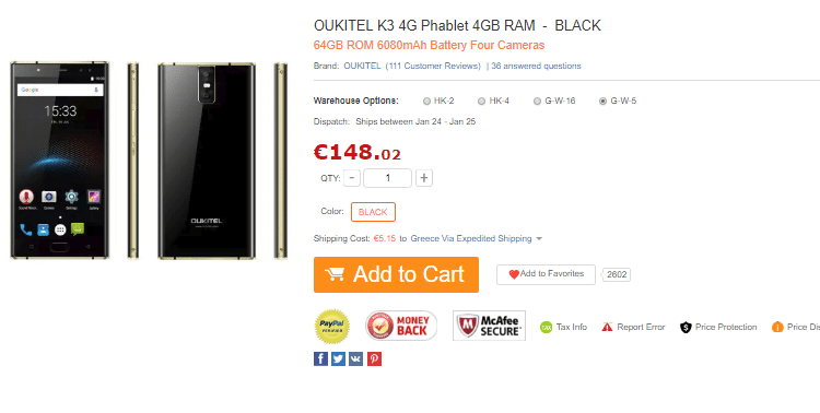 Το OUKITEL K3 μπορούμε να το αγοράσουμε από εδώ στη τιμή των €148.02, με φθηνή και ταχεία αποστολή από τις Ευρωπαϊκές αποθήκες, που σημαίνει ότι δεν υπάρχουν τελωνειακοί δασμοί. Η συσκευασία περιλαμβάνει προστατευτικό οθόνης και μια θήκη πλάτης.
