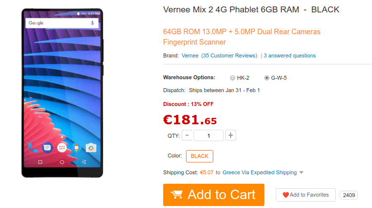 Το Vernee Mix 2 4G κοστίζει €181.65 και μπορούμε να το αγοράσουμε από εδώ με ταχεία παράδοση και φθηνά έξοδα αποστολής στα €5.07, χωρίς κανένα απολύτως κίνδυνο τελωνείου.