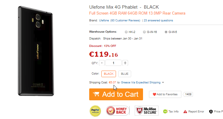 Η τιμή του Ulefone Mix 4G ανέρχεται στα €119.16 και μπορούμε να το παραγγείλουμε από εδώ, με φθηνή αποστολή από τις ευρωπαϊκές αποθήκες χωρίς κανένα απολύτως κίνδυνο τελωνείου. Το 4G LTE phablet συνοδεύεται με θήκη της εταιρείας και προστασία οθόνης.