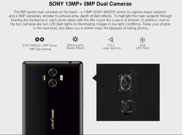 To Ulefone Mix έχει τρεις κάμερες, 13.0 ΜΡ και 5.0 ΜΡ οι οπίσθιες από την Sony, και 13.0 ΜΡ η μπροστινή. Διαθέτει διπλό φλας.