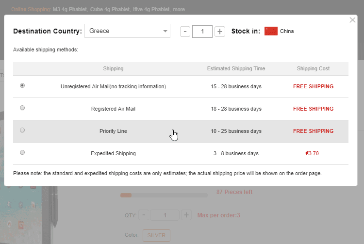 Ενώ υπάρχει δωρεάν αποστολή, ο ενδεδειγμένος τρόπος αποστολής που είναι 100% αποτελεσματικός στο να γλιτώσουμε το τελωνείο είναι η επιλογή Priority Line, που έτσι και αλλιώς μας την προσφέρει εντελώς δωρεάν το GearBest. Το 4G Tablet θα έρθει στο σπίτι μας με courier.