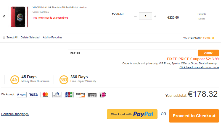 Το κόκκινο Mi A1 μπορούμε να το αγοράσουμε από εδώ στη πολύ φιλική τιμή των €178.32 μόνο για λίγες ημέρες. Για να επιτύχουμε την χαμηλή τιμή της προσφοράς πρέπει να κάνουμε χρήση του ακόλουθου κουπονιού.