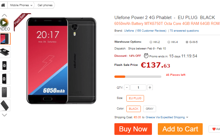 Η φθηνή τιμή του Ulefone Power 2 ανέρχεται στα €137.63 με φθηνή (€5.05) και ταχεία αποστολή από τις Ευρωπαϊκές αποθήκες του Gearbest, που σημαίνει ότι δεν υπάρχουν τελωνειακοί δασμοί.