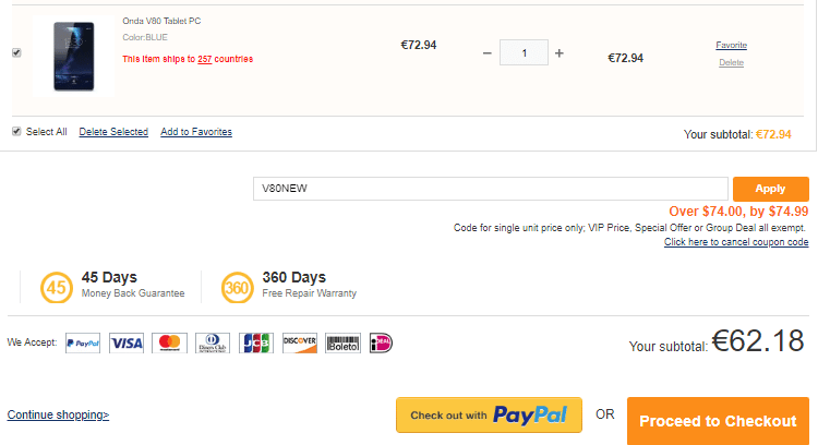Το Onda V80 κοστίζει €62.18 και μπορούμε να το αγοράσουμε από εδώ. Συνοδεύεται από ένα προστατευτικό οθόνης. Για να επιτύχουμε την χαμηλότερη τιμή πρέπει να κάνουμε χρήση του ακόλουθου κουπονιού: