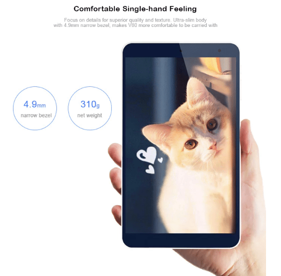 Το tablet έχει οθόνης αφής IPS στις 8 ίντσες, και έρχεται με ανάλυση στα 1920 x 1200 . Διαθέτει τον τετραπύρηνο επεξεργαστή 64-bit Allwinner A64 Quad Core 1.3GHz( Cortex-A53 x 4 ) με την Mali-T720 MP2.