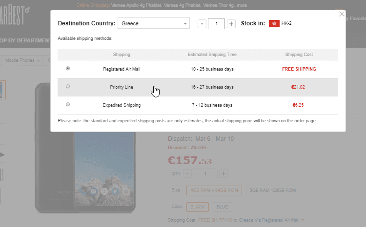 Ενώ υπάρχει δωρεάν αποστολή, ο ενδεδειγμένος τρόπος αποστολής που είναι 100% αποτελεσματικός στο να γλιτώσουμε το τελωνείο είναι η επιλογή Priority. Το κινητό θα έρθει στο σπίτι μας με courier.