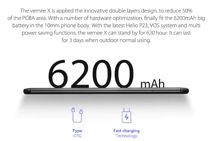 Το Vernee X έχει τεράστια μπαταρία έχει χωρητικότητα στα 6200mAh που υποστηρίζει ταχεία φόρτιση.
