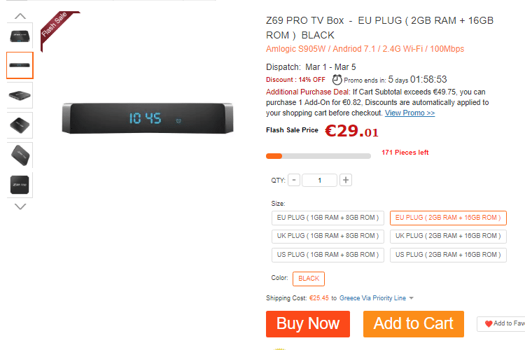 Η τιμή του TV Box θα βρίσκεται στα €29.01. Μπορούμε να το αγοράσουμε από εδώ επιλέγοντας την Priority Line που είναι ο ενδεδειγμένος τρόπος αποστολής για να γλιτώσουμε το τελωνείο.
