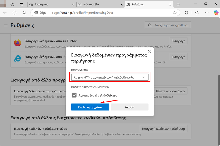 Στο πλαίσιο που θα ανοίξει, διαλέγουμε το “Αρχείο HTML αγαπημένων ή σελιδοδεικτών” και πατάμε “Επιλογή αρχείου.