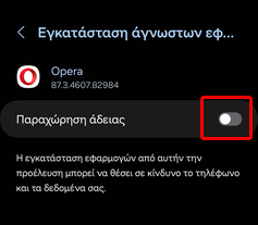 Έπειτα, ενεργοποιούμε τον διακόπτη δίπλα στο “Παραχώρηση άδειας”, ώστε να μπορεί ο browser να εγκαθιστά εφαρμογές με αρχεία APK.