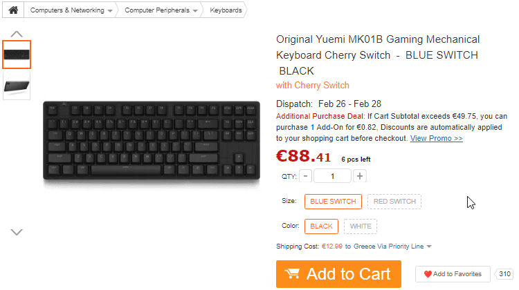 Ενώ υπάρχει δωρεάν αποστολή, ο ενδεδειγμένος τρόπος αποστολής που είναι 100% αποτελεσματικός στο να γλιτώσουμε το τελωνείο είναι η επιλογή Priority Line. Το πληκτρολόγιο θα έρθει στο σπίτι μας με courier.