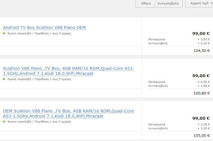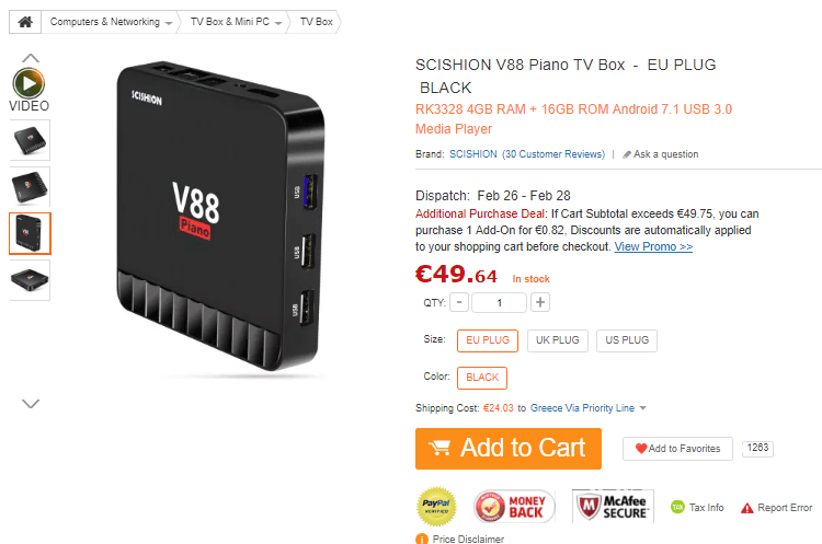 Η τιμή του TV Box θα βρίσκεται στα €49.64. Μπορούμε να το αγοράσουμε από εδώ, επιλέγοντας την Priority αποστολή αν ανησυχούμε για τελωνειακούς δασμούς. Ειδάλλως υπάρχει και δωρεάν αποστολή.