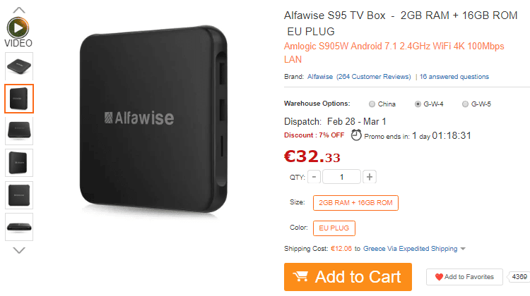 Η τιμή του TV Box θα βρίσκεται σε πτώση για λίγες ημέρες στα €32.33. Μπορούμε να το αγοράσουμε από εδώ με ταχεία αποστολή από τις Ευρωπαϊκές αποθήκες, που σημαίνει ότι δεν υπάρχουν τελωνειακοί δασμοί.