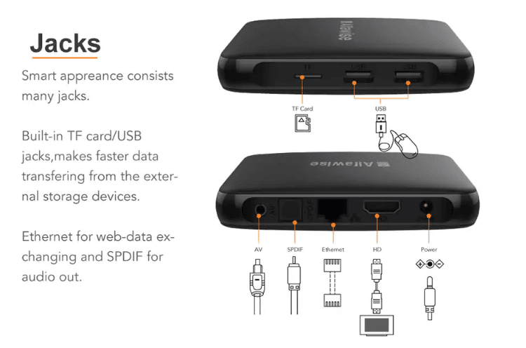 - Διασύνδεση: θύρα τροφοδοσίας DC, HDMI, RJ45, SPDIF, υποδοχή κάρτα TF, USB 2.0