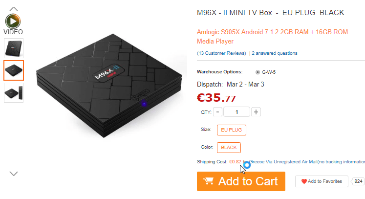 Η τιμή του TV Box θα βρίσκεται στα €35.77. Μπορούμε να το αγοράσουμε από εδώ με ταχεία και φθηνή αποστολή €0.82 από τις Ευρωπαϊκές αποθήκες, που σημαίνει ότι δεν υπάρχουν τελωνειακοί δασμοί.
