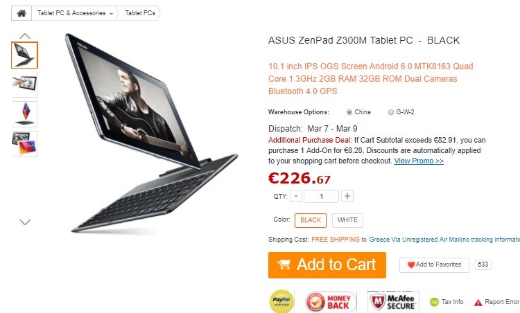 Το ZenPad μπορούμε να το αγοράσουμε από εδώ. Το tablet θα διατίθεται στη τιμή των €226.67. Ο ενδεδειγμένος τρόπος αποστολής που είναι 100% αποτελεσματικός στο να γλιτώσουμε το τελωνείο είναι η επιλογή Priority Line. Το tablet θα έρθει στον χώρο μας με courier.