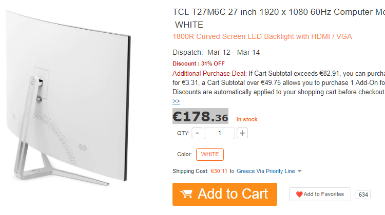 Το Gearbest καθημερινά μας φέρνει προσφορές σε κάθε λογής κινητές συσκευές. Όμως, υπάρχουν ευκαιρίες και σε άλλα είδη τεχνολογίας που ξεχωρίζουν. Δείτε το πολύ λεπτό και bezel-less καμπύλο monitor TCL T27M6C 27 ιντσών Full HD, με χρόνο απόκρισης 6ms, ωραίο design και πολύ ζωντανά χρώματα, σε φιλική τιμή με αποστολή χωρίς τον κίνδυνο του τελωνείου.
