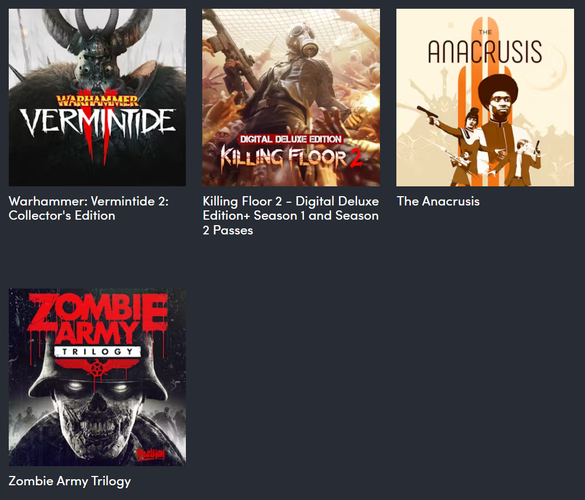 Συγκεκριμένα, πληρώνοντας από 7,47€ και πάνω, παίρνουμε το “Warhammer: Vermintide 2: Collector's Edition”, το “Killing Floor 2 – Digital Deluxe Edition+ Season 1 and Season 2 Passes”, το “The Anacrusis”, και το “Zombie Army Trilogy”.