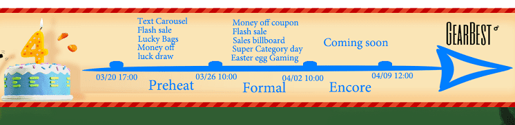 Η γιορτή των γενεθλίων του Gearbest χωρίζεται σε τρεις κύριες φάσεις. Η πρώτη θα διαρκέσει από τις 20 έως 26 Μαρτίου, και η δεύτερη (main event), που έχει τις μεγαλύτερες προσφορές, από τις 26 Μαρτίου έως 2 Απριλίου.