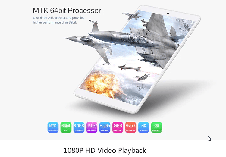 Το tablet ξεχωρίζει από το λεπτό και πολύ ελαφρύ σχεδιασμό. Έχει capacitive οθόνη αφής IPS 5 σημείων στις 8.0 ίντσες, και με ανάλυση στα 1280 x 800.