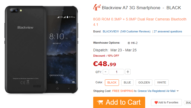 Οι μεγάλες εκπτώσεις στα γενέθλια του Gearbest καλά κρατούν, και οι τιμές στα κινητά έπιασαν πάτο. Δείτε το πολύ οικονομικό Blackview A7, με οθόνη 5.0 ιντσών, Android 7.0, τρεις κάμερες και αξιοπρεπή χαρακτηριστικά, σε πολύ χαμηλή τιμή και με Priority αποστολή χωρίς τον κίνδυνο του τελωνείου.