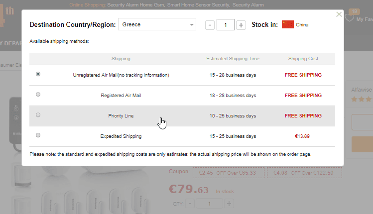 O ενδεδειγμένος τρόπος αποστολής που είναι 100% αποτελεσματικός στο να γλιτώσουμε το τελωνείο είναι η επιλογή Priority Line που μας την προσφέρει εντελώς δωρεάν το Gearbest. Το έξυπνο σύστημα συναγερμού θα έρθει στο σπίτι μας με courier.