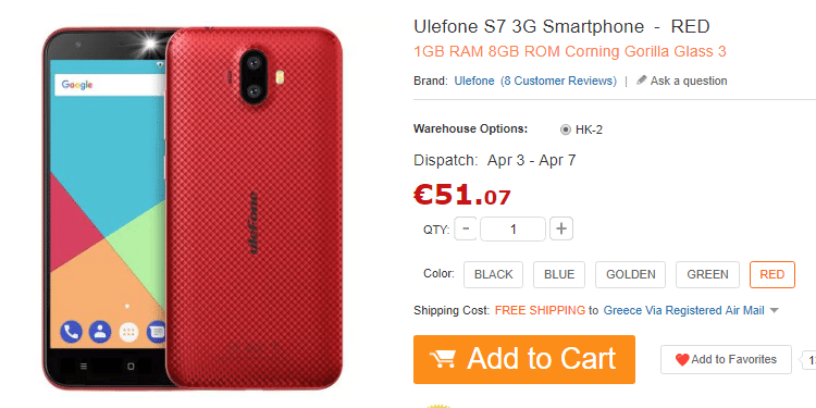 Η τιμή του Ulefone S7 ανέρχεται στα €51.07. Συνοδεύεται από θήκη της εταιρείας και μπορούμε να το παραγγείλουμε από εδώ. Διατίθεται σε πέντε χρώματα.