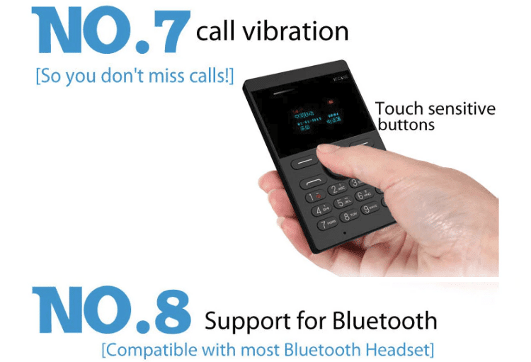 Ταυτόχρονα είναι και ένα μικρό και φορητό Mp3 player με FM ραδιόφωνο, αλλά και με Bluetooth και ξυπνητήρι. Το mini Card Phone δέχεται μια κάρτα SIM και μια microSD. Η μπαταρία του κινητού έχει χωρητικότητα στα 320mAh.
