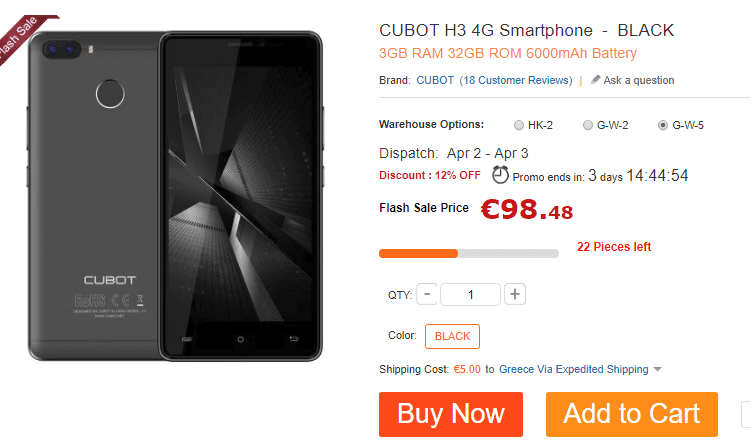 Η τιμή του CUBOT H3 ανέρχεται στα €98.48. Συνοδεύεται από θήκη της εταιρείας και μπορούμε να το παραγγείλουμε από εδώ με ταχεία και πολύ φθηνή αποστολή από την Ευρώπη χωρίς τον κίνδυνο του τελωνείου.