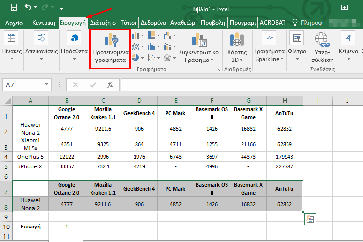 Τώρα κάνουμε κλικ στην “Εισαγωγή”, και επιλέγουμε το “Προτεινόμενα γραφήματα”. Αυτή η επιλογή θα μας εμφανίσει ένα παράθυρο με προτεινόμενες γραφικές παραστάσεις που ταιριάζουν στην περίπτωσή μας.