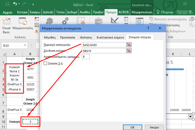 Πριν προχωρήσουμε στη δημιουργία κάποιου γραφήματος, ας κάνουμε μία δοκιμή. Τώρα η συνάρτηση μας διαβάζει το “3”, και προβάλει τα δεδομένα του OnePlus 5. Αν αλλάξουμε την “Επιλογή” σε “1”, θα αλλάξουν αυτόματα τα περιεχόμενα των κελιών με τα δεδομένα του “Huawei Nona 2”.