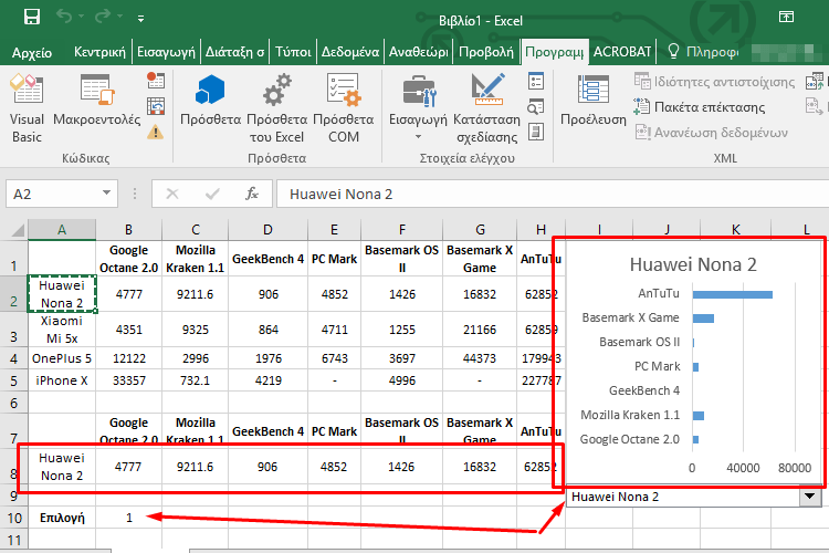 Από εδώ και πέρα, όμως, η “Επιλογή” θα ορίζεται σύμφωνα με ό,τι διαλέγουμε στο μενού μας. Έτσι, αν επιλέξουμε το “Huawei Nona 2”, η επιλογή θα γίνει “1”, τα δεδομένα θα συμπληρωθούν σύμφωνα με αυτό, και το γράφημά μας επίσης.