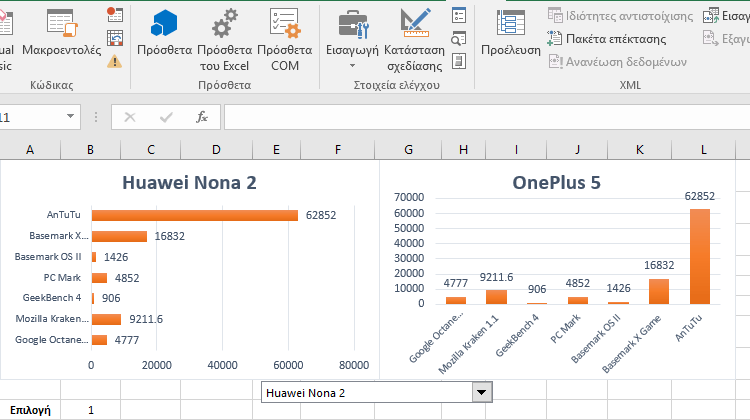 Από εδώ και πέρα, όμως, η “Επιλογή” θα ορίζεται σύμφωνα με ό,τι διαλέγουμε στο μενού μας. Έτσι, αν επιλέξουμε το “Huawei Nona 2”, η επιλογή θα γίνει “1”, τα δεδομένα θα συμπληρωθούν σύμφωνα με αυτό, και το γράφημά μας επίσης.