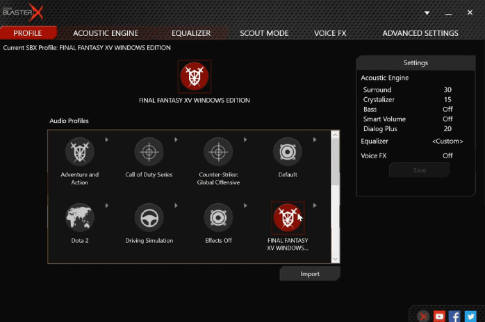 Μέσω USB μπορούμε να βάλουμε σε λειτουργία το λογισμικό της Creative, το οποίο κάνει θαύματα. Πρώτα απ’ όλα, διαθέτει εξειδικευμένα προφίλ ήχου για δημοφιλή παιχνίδια όπως το Overwatch, το Counter Strike, LoL, Dota 2, και πολλά άλλα.