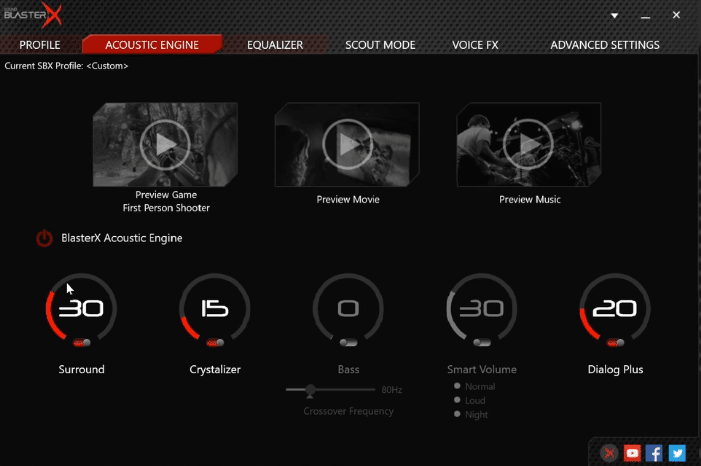 Από το BlasterX Acoustic Engine Pro – όπως ονομάζει το λογισμικό η εταιρεία – έχουμε πρόσβαση στις ρυθμίσεις για ψηφιακό ήχο 7.1, Equalizer, και διάφορα άλλα καλούδια.