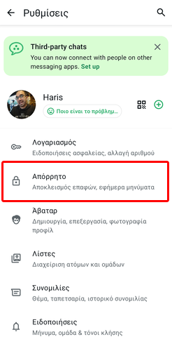 Έπειτα, μπαίνουμε στις ρυθμίσεις και πατάμε “Απόρρητο”.