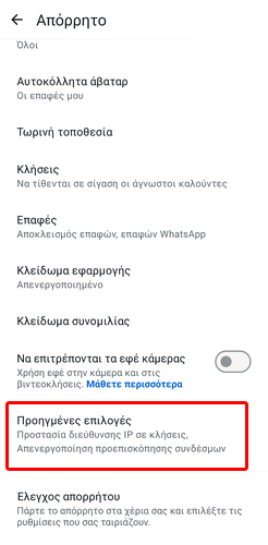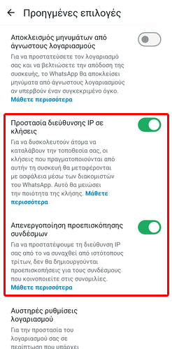 Μετά, ενεργοποιούμε τους διακόπτες για την “Προστασία διεύθυνσης IP σε κλήσεις” και την “Απενεργοποίηση προεπισκόπησης συνδέσμων”.